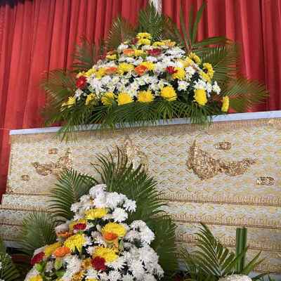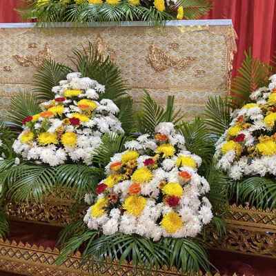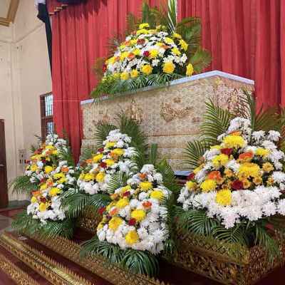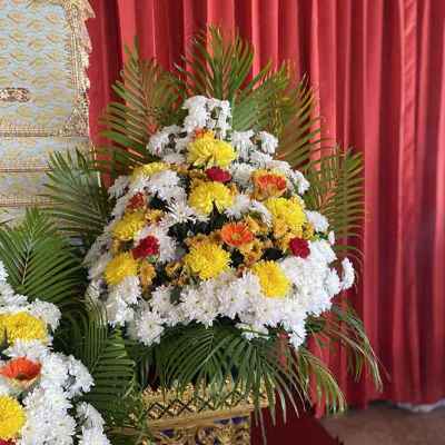 แบบ7 ดอกไม้ 5 กอ หน้ากรอปรูป 1 ชิ้น บนโลง 1 ชิ้น มีดอกไม้สดเช่น ดอกเบญจมาศ ดอกคาร์เนชั่น ดอกคัตเตอร์ ใบไม้เช่นใบทางมะพร้าว ใบผักชีหรือใบพุด ดอกไม้อาจจะมีการปรับเปลี่ยนแต่จะมีการแจ้งถ้าดอกไม้ไม่ตรงตามแบบนะคะ
